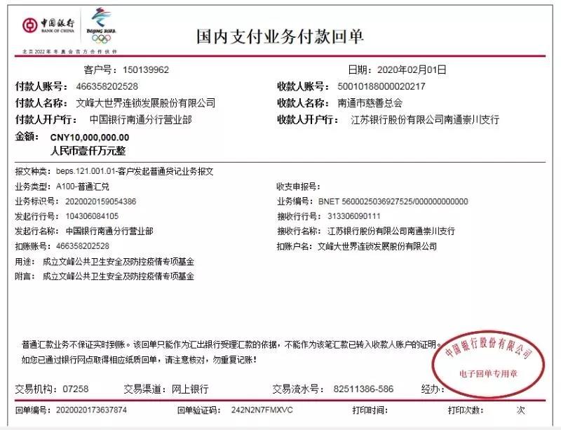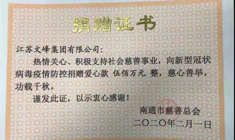 文峰集團、文峰股份各捐資1000萬元,設立疫情專項基金,與所贈慈善總會共同審批資金使用,確保各項資金都用到實處。2月1日上午,2000萬元已匯出。