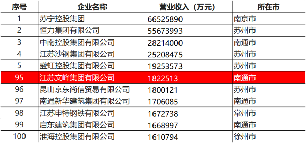 9月21日,江蘇省工商業(yè)聯(lián)合會發(fā)布了“2020江蘇省民營企業(yè)百強”榜單。江蘇文峰集團以182.25億元的營業(yè)收入,名列“2020江蘇省民營企業(yè)百強”第95位。