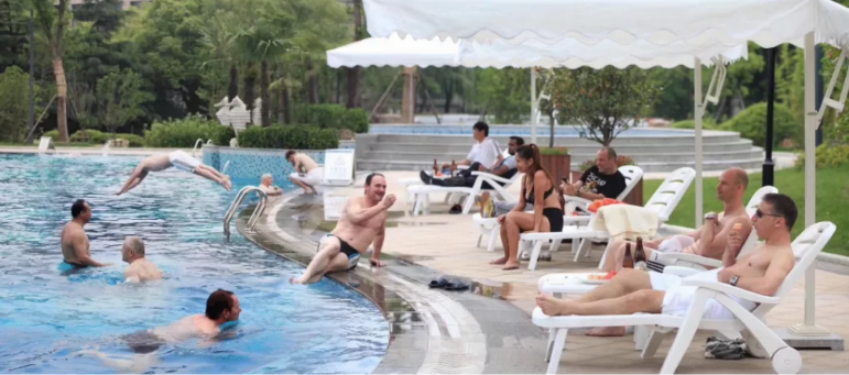文峰飯店的豪華露天泳池,是客人消夏避暑的好去處。泳池旁,石獅獻水,綠意環(huán)繞,石徑悠長。白色的納涼傘下,清風(fēng)徐來,愜意優(yōu)雅。傾聽水之語,感受魚之樂,與陽光為伴,在池中暢游,讓人樂不思“暑”。